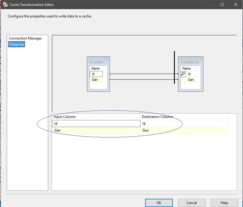 8.Now, open the Cache Transformation Editor ( by single clicking on the component) ,navigate to the Mappings tab and connect input and destination columns:
