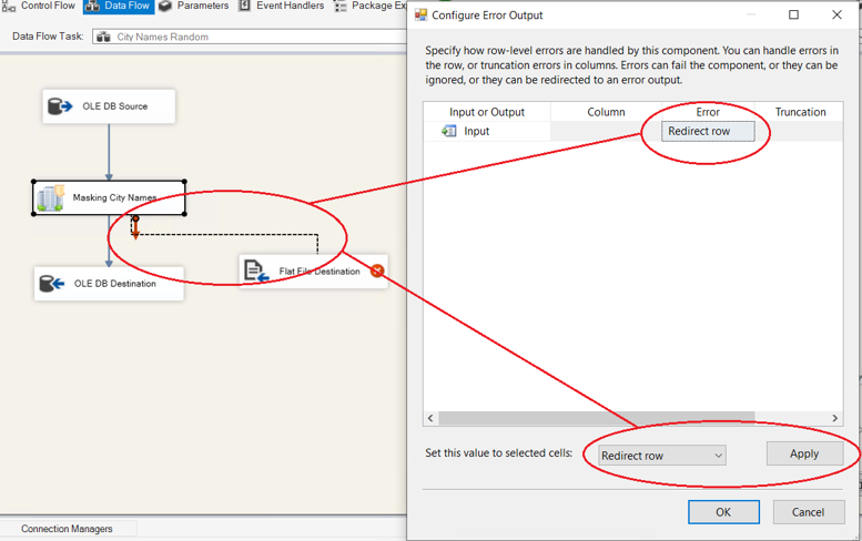 9. If, however, there are invalid values in the package's source, one would need to configure error handling. Invalid values are those that are not conforming to the rules of the entity. To handle invalid values, each data masking component has error handling precedence constraint. One needs to create error destination connection and connect red arrow (error handling constraint) with this destination. As the connection is made, one needs to configure the state of failure: “Fail”,”Ignore” or “Redirect”.
