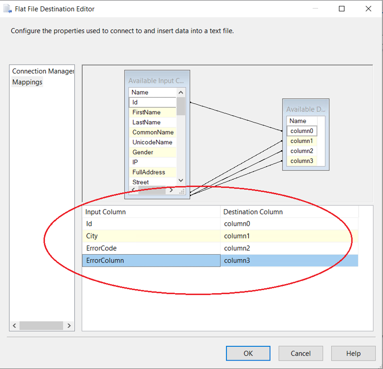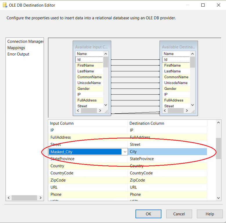 7. Create a connection manager for the destination and configure source component for the destination. In the connection manager, in the tab “Mappings”, specify that you want newly created Field(s)_Masked to be a field(s) replacing the original value. For that, just click on the available input columns, choose the masked value, and map to the “Available Destination Columns”