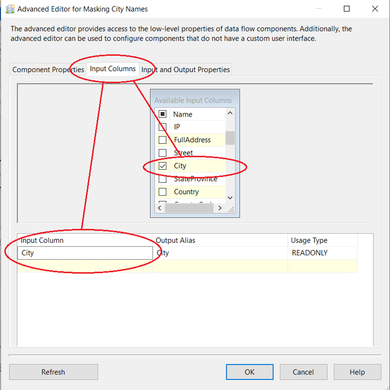 5. In the second tab, there are input columns. Please check-mark only the column(s) that you will be masking with the City Name algorithm:
