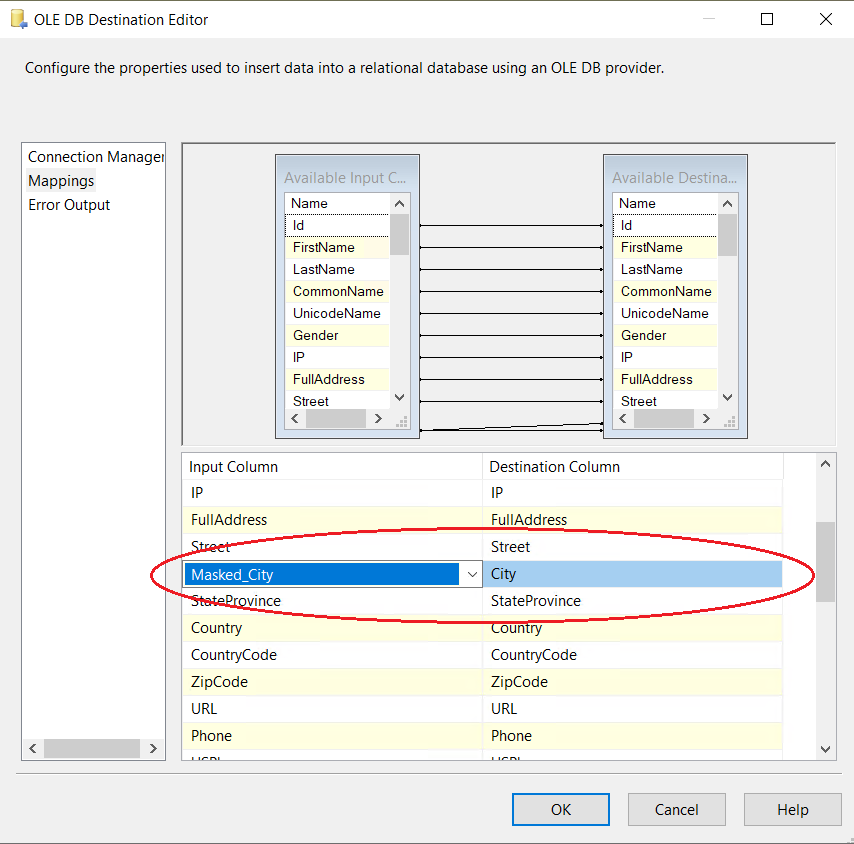 7. Create a connection manager for the destination and configure source component for the destination. In the connection manager, in the tab “Mappings”, specify that you want newly created Field_Masked to be a field replacing the original value. For that, just click on the available input columns, choose the masked value, and map to the “Available Destination Columns”