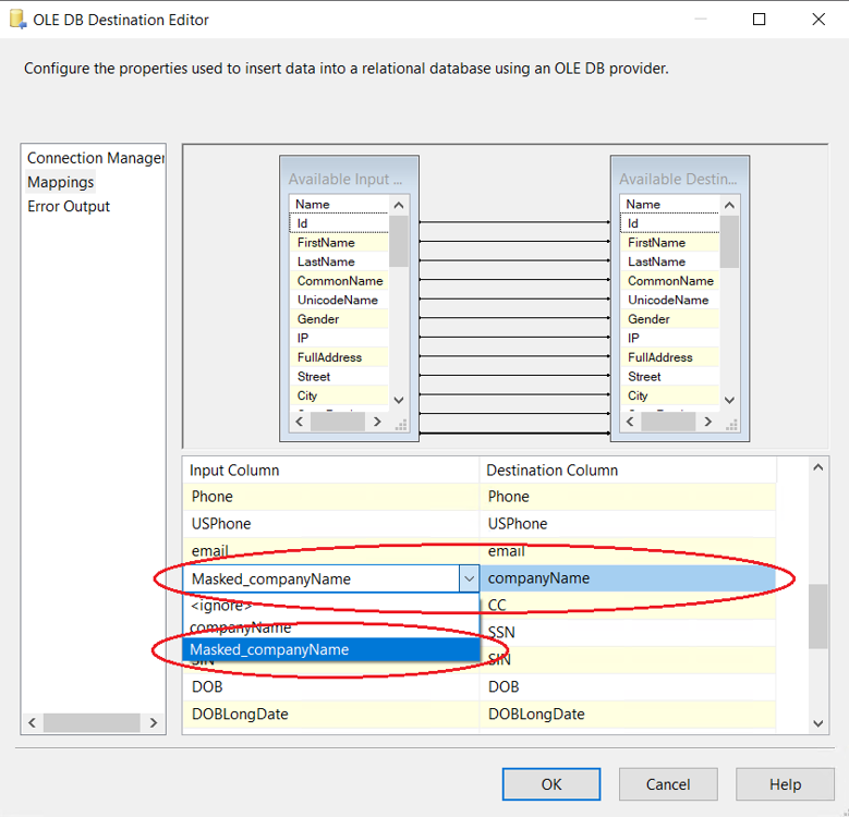 7. Create a connection manager for the destination and configure source component for the destination. In the connection manager, in the tab “Mappings”, specify that you want newly created Field_Masked to be a field replacing the original value. For that, just click on the available input columns, choose the masked value, and map to the “Available Destination Columns”