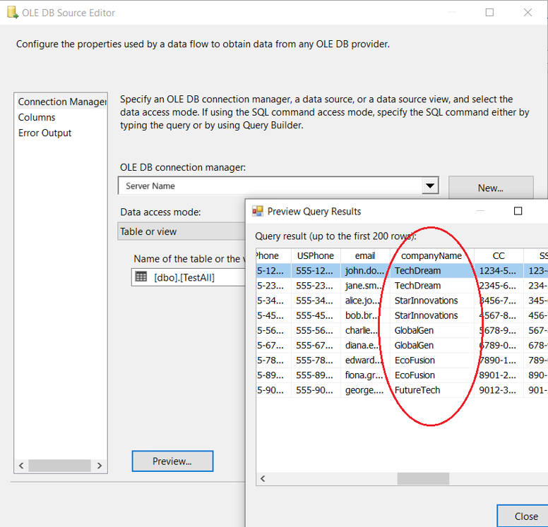 8. Now, all the configurations are complete for the valid values. You can run the package with the Company Name Dynamic Data Masking component, and see the results of data masking: