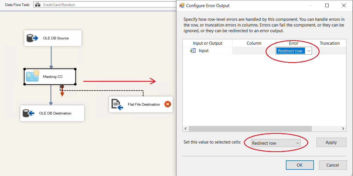 9. If, however, there are invalid values in the package's source, one would need to configure error handling. Invalid values are those that are not conforming to the rules of the entity. To handle invalid values, each data masking component has error handling precedence constraint. One needs to create error destination connection and connect red arrow (error handling constraint) with this destination. As the connection is made, one needs to configure the state of failure: “Fail”,”Ignore” or “Redirect”.