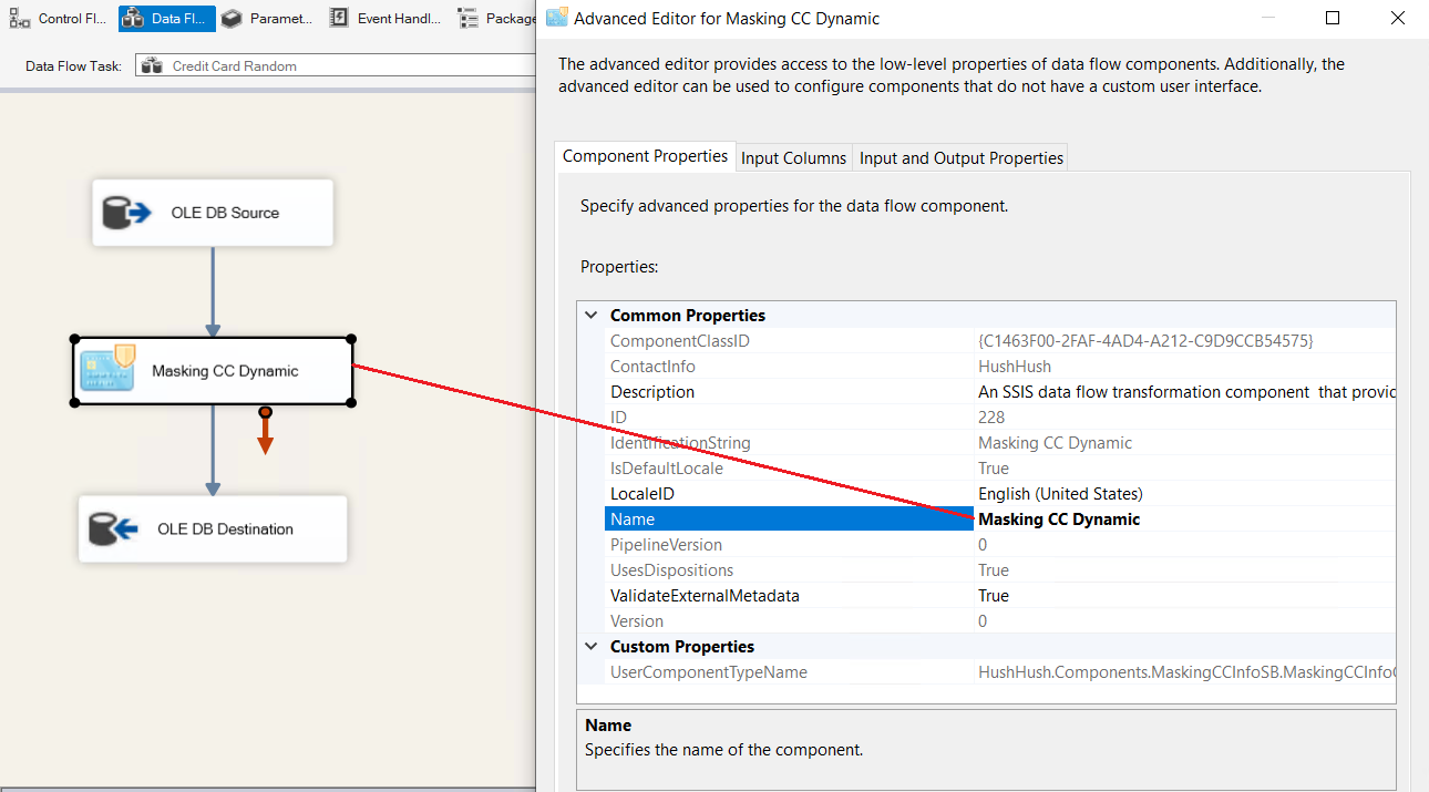 2. Drag and Drop Credit Card Dynamic masking component, connect the source and the Credit Card Dynamic data masking component with the source's precedence constraint: