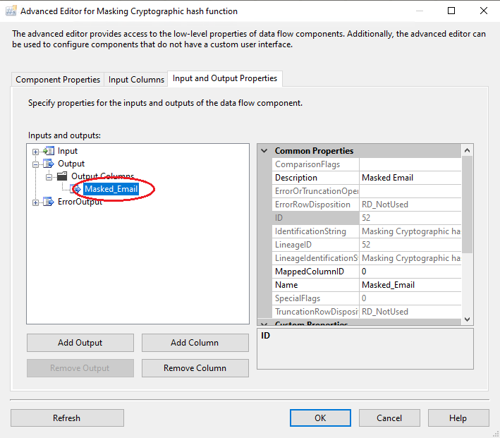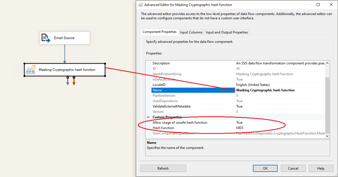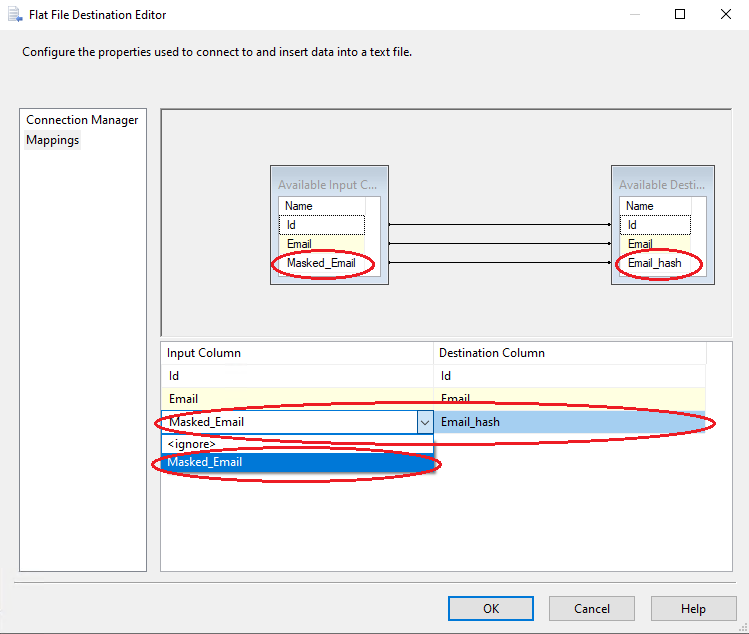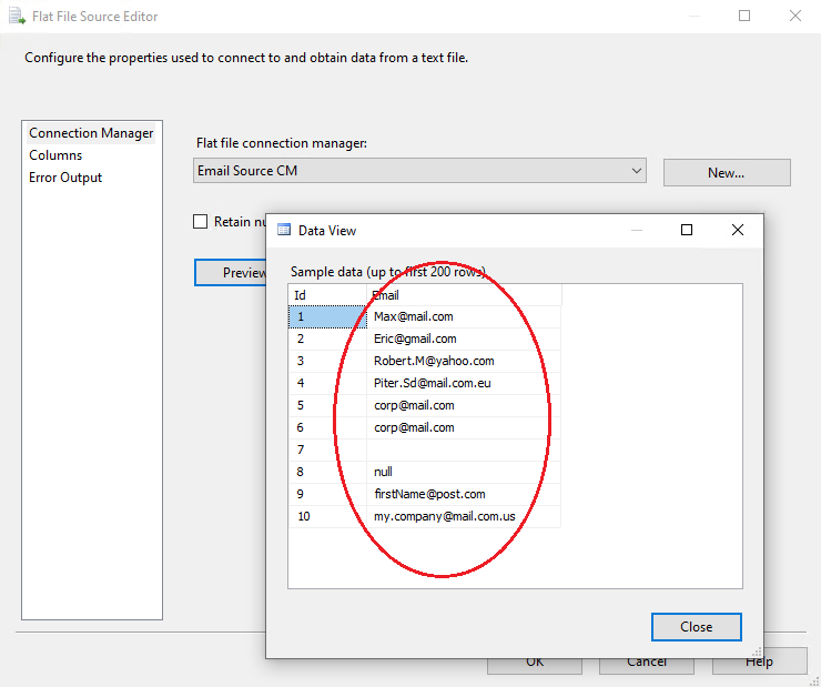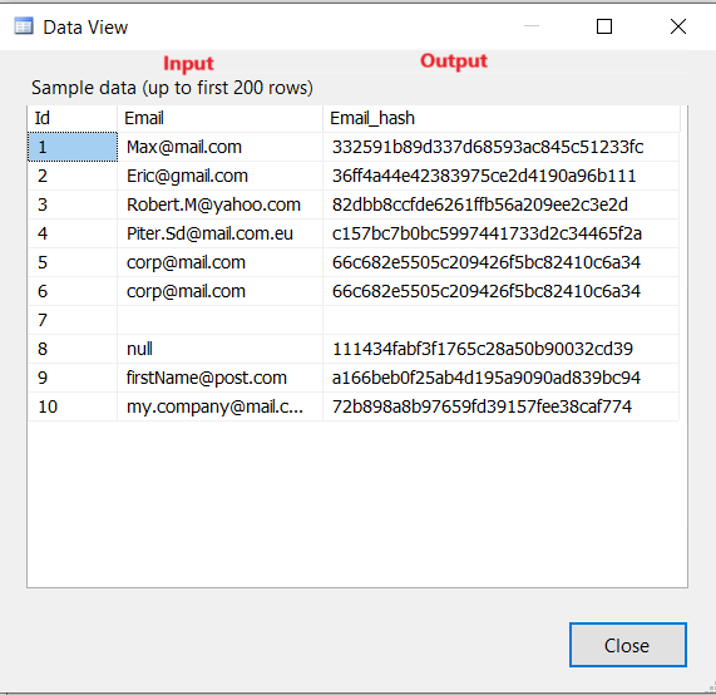 8. Now, all the configurations are complete for the valid values. You can run the package with the Cryptographic hash function data masking component, and see the results of data masking in the Destination component by clicking the Preview button: