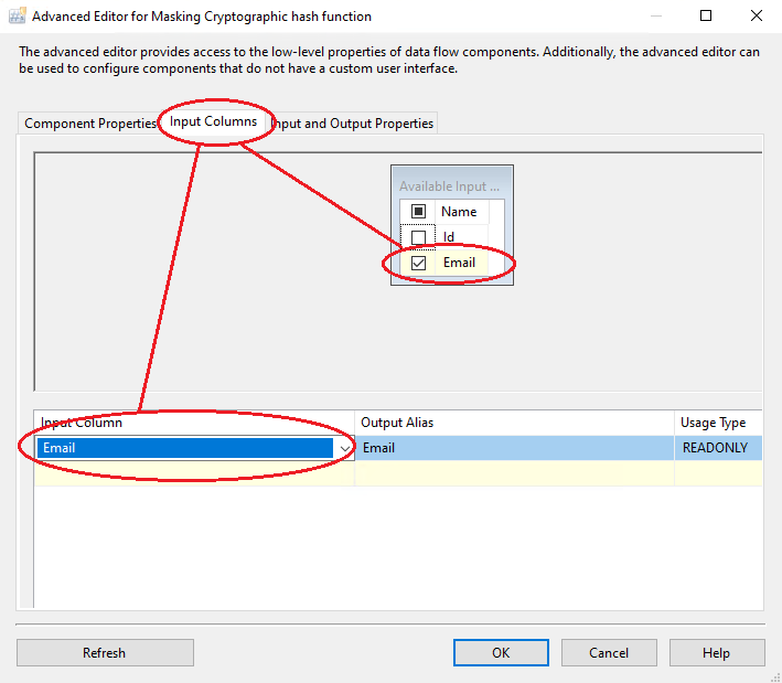 5. In the Input Columns tab, check only the columns you want to mask using the Cryptographic hash function algorithm: