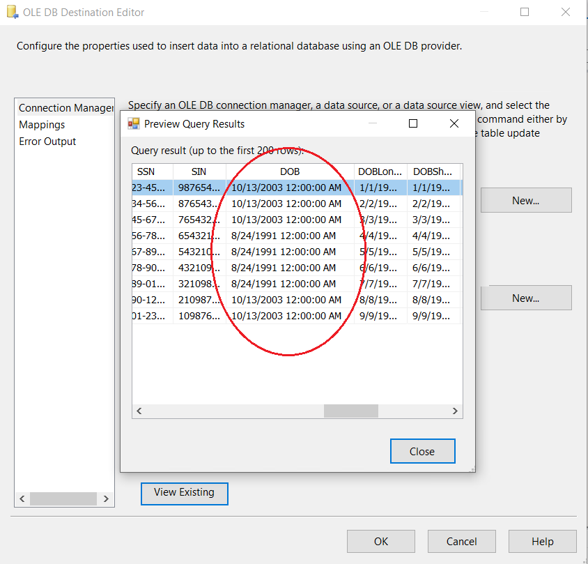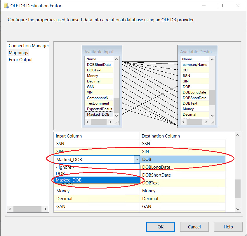7. Create a connection manager for the destination and configure the source component for the destination. In the connection manager, in the tab “Mappings”, specify that you want the newly-created Field_Masked to be a field replacing the original value. For that, just click on the available input columns, choose the masked value, and map to the “Available Destination Columns”