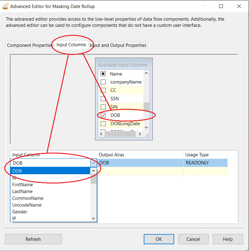 5. In the second tab, there are input columns. Please check-mark only one column, the one that you will be masking with Masking Data Rollup algorithm: