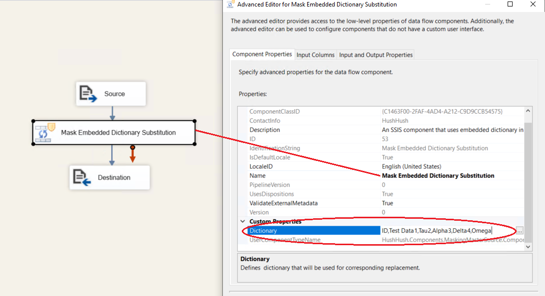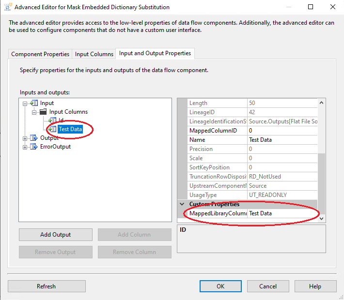 7. The component will create an additional column with the prefix Masked_. You must specify the created dictionary in the Custom property for this new "MappedLibraryColumn" column.