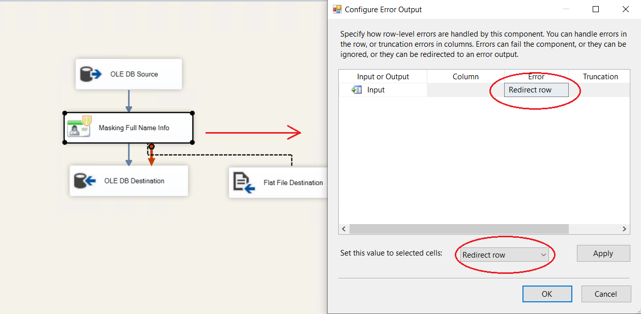 9. If, however, there are invalid values in the package's source, one would need to configure error handling. Invalid values are those that are not conforming to the rules of the entity. To handle invalid values, each data masking component has error handling precedence constraint. One needs to create error destination connection and connect red arrow (error handling constraint) with this destination. As the connection is made, one needs to configure the state of failure: “Fail”,”Ignore” or “Redirect”.