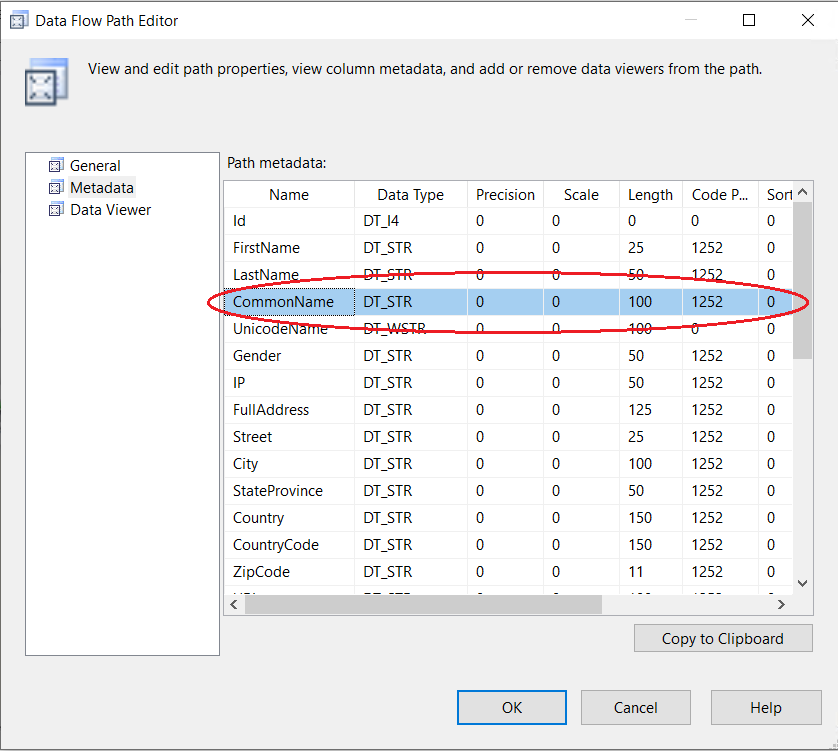 3. Now, the precedence constraint (the blue arrow) passes proper meta-data to the Full Name Info component. If you click on constraint, you will see: