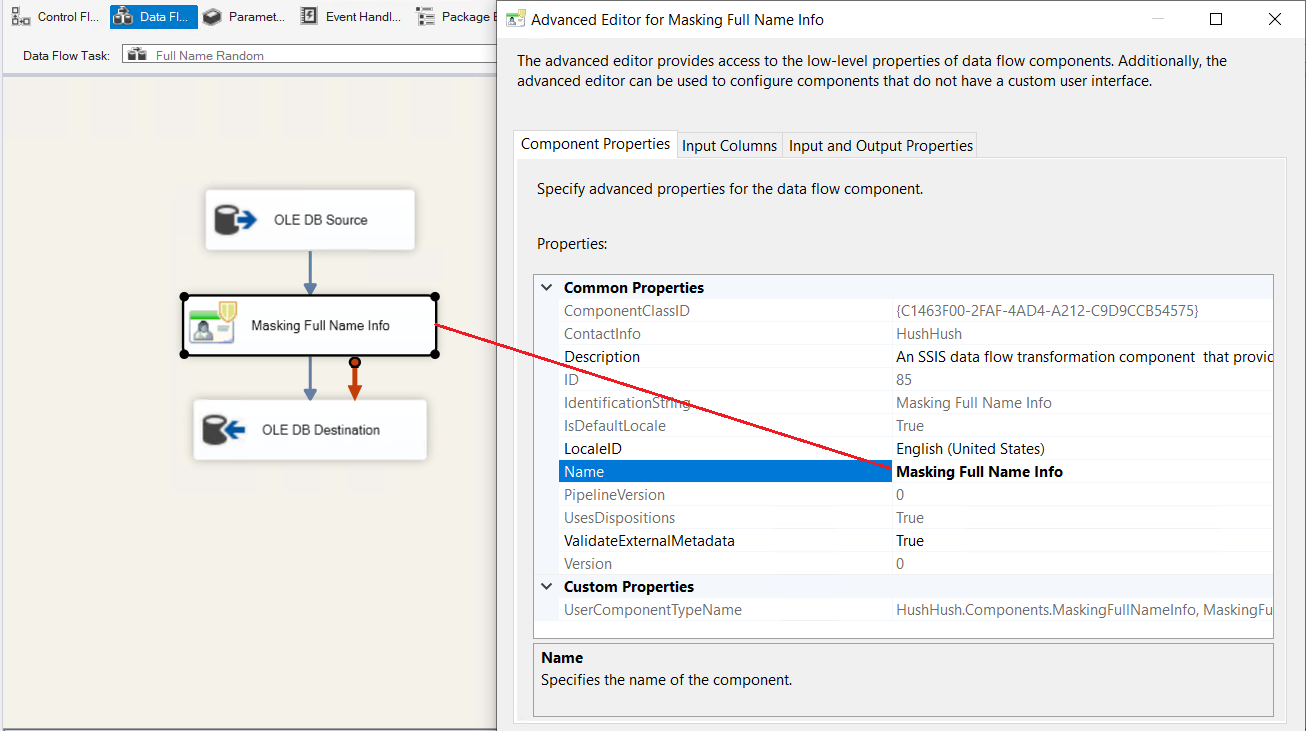 2. Drag and Drop Full Name Info masking component, connect the source and the Full Name Info component with the source's precedence constraint: