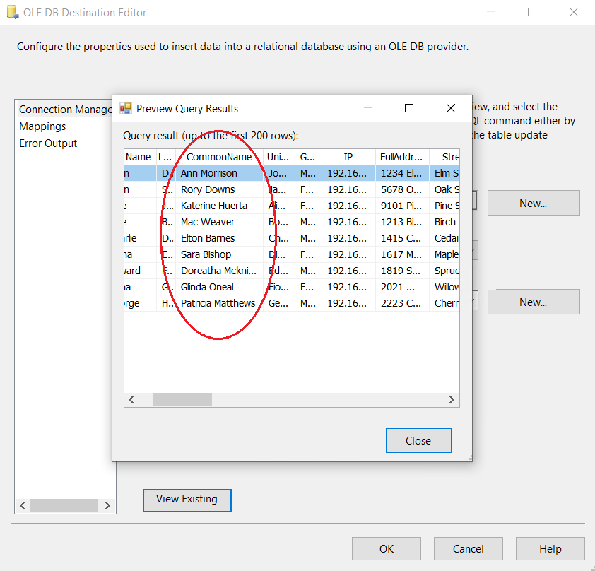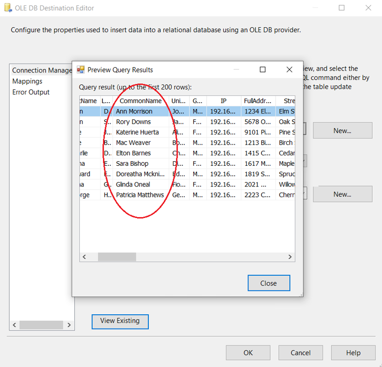 7. Create a connection manager for the destination and configure source component for the destination. In the connection manager, in the tab “Mappings”, specify that you want newly created Field_Masked to be a field replacing the original value. For that, just click on the available input columns, choose the masked value, and map to the “Available Destination Columns”