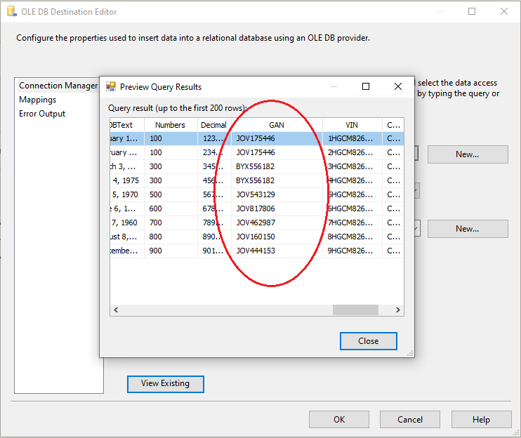 7. Create a connection manager for the destination and configure source component for the destination. In the connection manager, in the tab “Mappings”, specify that you want newly created Field_Masked to be a field replacing the original value. For that, just click on the available input columns, choose the masked value, and map to the “Available Destination Columns”