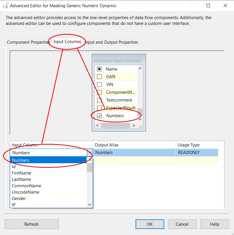 5. In the Input Columns tab, select only the columns you want to mask using the Generic Numeric Dynamic algorithm: