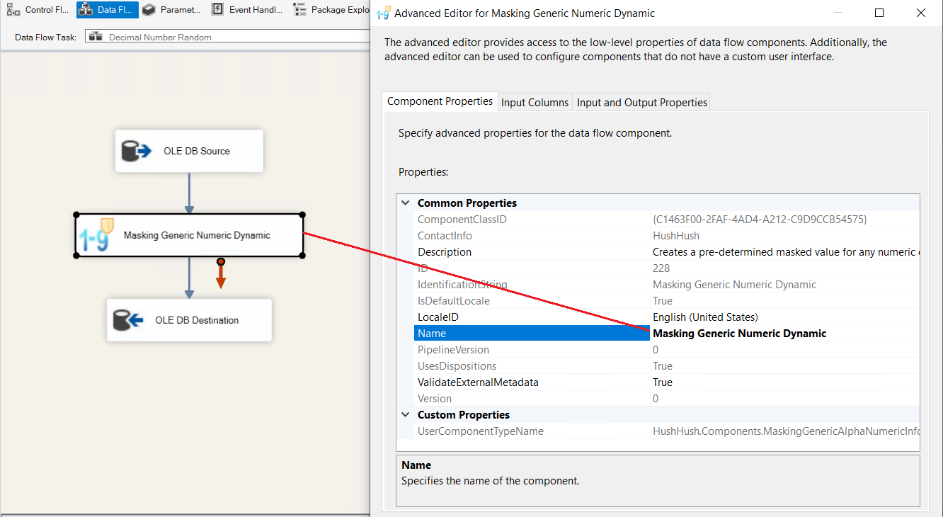 2. Drag and drop the Generic Numeric Dynamic masking component. Connect the source to the Generic Numeric Dynamic data masking component using the source's precedence constraint: