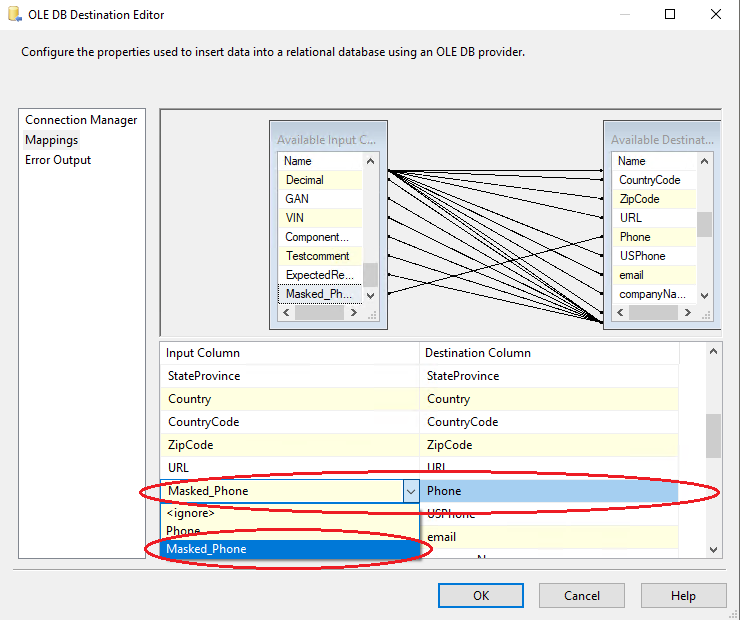 7. Create a connection manager for the destination and configure source component for the destination. In the connection manager, in the tab “Mappings”, specify that you want newly created Field_Masked to be a field replacing the original value. For that, just click on the available input columns, choose the masked value, and map to the “Available Destination Columns”