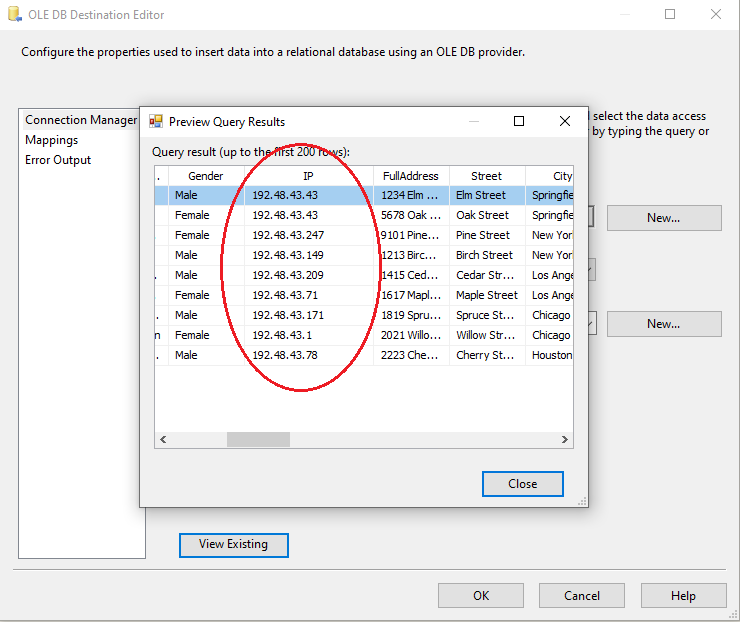 8. Now, all configurations for valid values are complete. You can run the package with the IP Address Dynamic data masking component and view the masked results in the Destination component by clicking the Preview button.