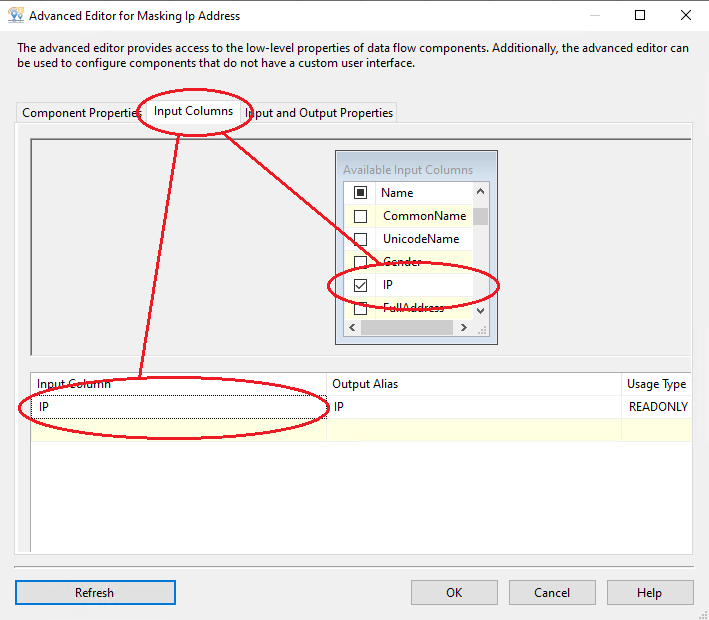 5. In the Input Columns tab, select only the columns that need to be masked using the IP Address Dynamic masking algorithm: