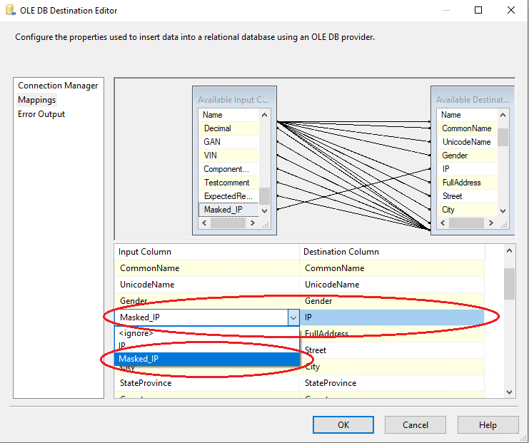 7. Create a Connection Manager for the destination. Configure the Source component for the destination. In the Mappings tab of the Connection Manager, map the newly created Masked_Field column to replace the original value by: