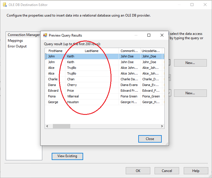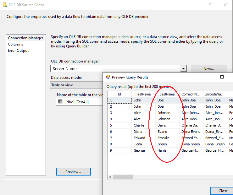 8. Now, all the configurations are complete for the valid values. You can run the package with the Last Name Dynamic Data Masking component, and see the results of data masking: