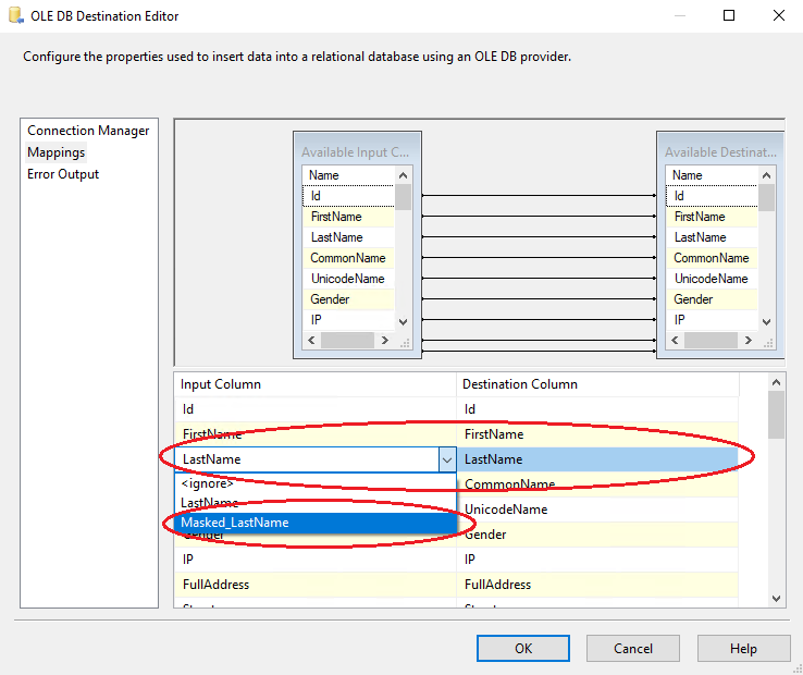 7. Create a connection manager for the destination and configure source component for the destination. In the connection manager, in the tab “Mappings”, specify that you want newly created Field_Masked to be a field replacing the original value. For that, just click on the available input columns, choose the masked value, and map to the “Available Destination Columns”