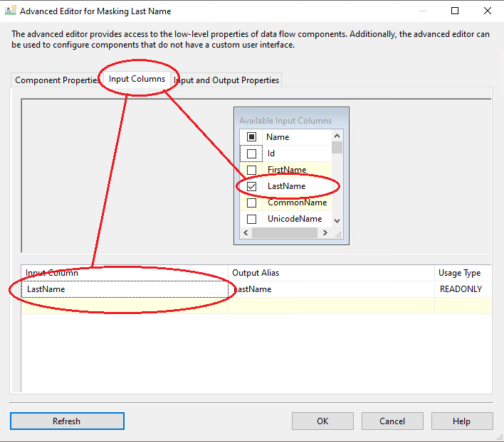 5. In the second tab, there are input columns. Please check-mark only one column, the one that you will be masking with Last Name Dynamic algorithm: