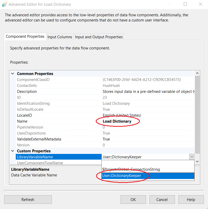 4. Now that the metadata for the Data Dictionary exists, and values are passed into the data masking Data Dictionary component, please open the component editor. In the custom properties of "Library Variable Name", please choose the variable of the **object type** that will hold data values as the dictionary. These values are the set that you customarily created.