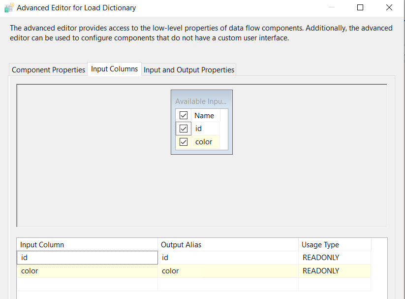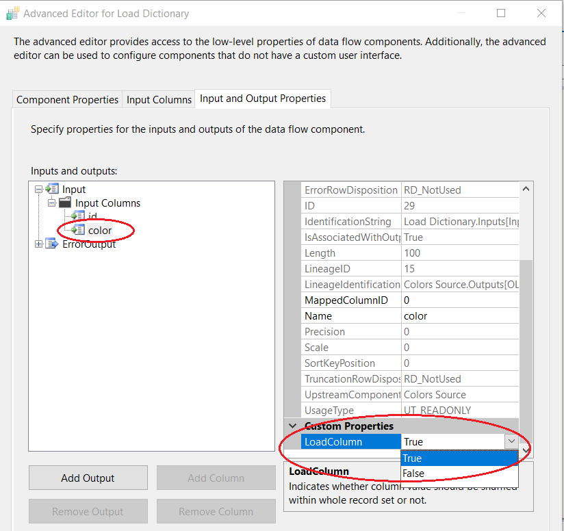 6. Now, we need to hint SSIS which column values will be loaded into the variable. In the third tab, "Input and Output Properties", expand input columns, highlight the column containing the data value ( in our case, it is "color"), and set its LoadColumn property to "True"