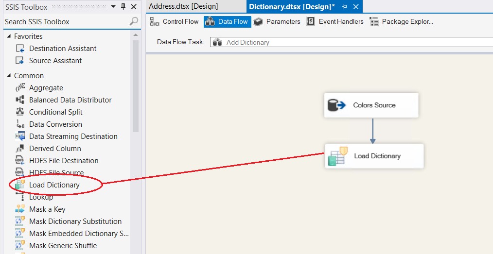 2. Drag and Drop Load Dictionary data masking component, and connect the source and the Load Dictionary component.