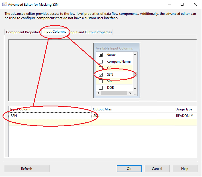 5. In the second tab, there are input columns. Please check-mark only one column, the one that you will be masking with SSN algorithm:
