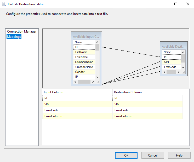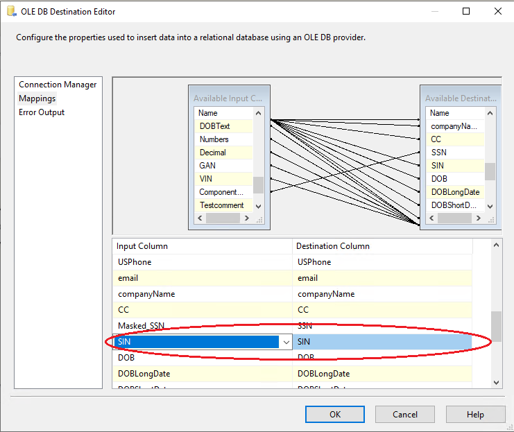 7. Create a connection manager for the destination and configure source component for the destination. In the connection manager, in the tab “Mappings”, specify that you want newly created Field_Masked to be a field replacing the original value. For that, just click on the available input columns, choose the masked value, and map to the “Available Destination Columns”