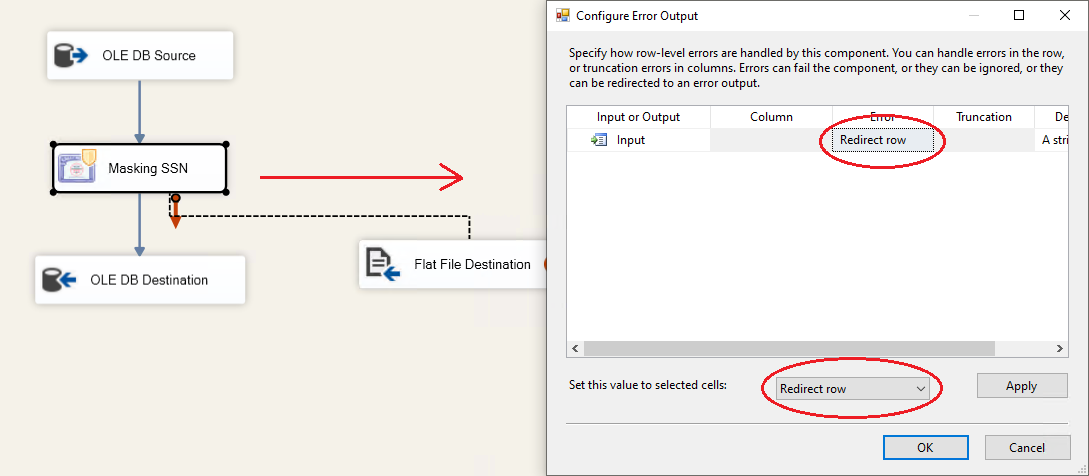 10. It is recommended that one re-directs the output into the error destination, so that later one be able to analyze and process data for quality purposes. The SSN Dynamic data masking components errors are the only ones not recommended for further processing as it is truly hard to break their format.