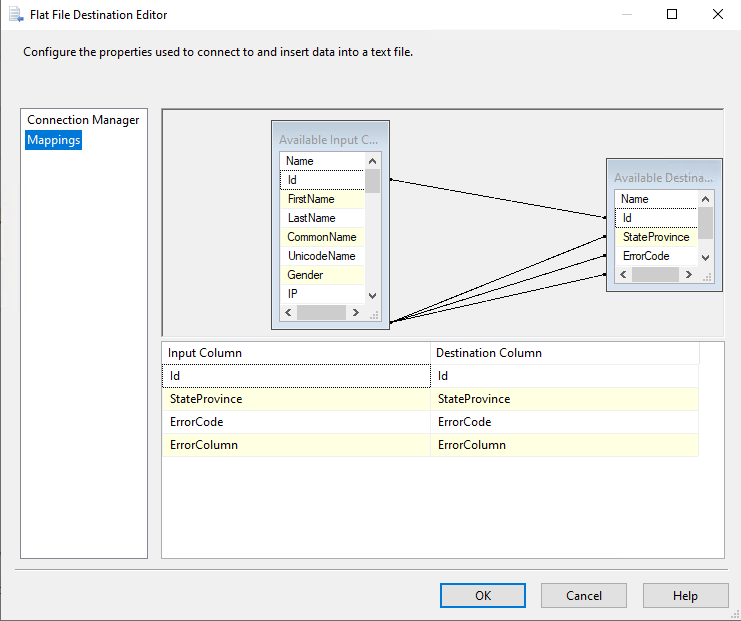 7. Create a connection manager for the destination and configure source component for the destination. In the connection manager, in the tab “Mappings”, specify that you want newly created Field_Masked to be a field replacing the original value. For that, just click on the available input columns, choose the masked value, and map to the “Available Destination Columns”