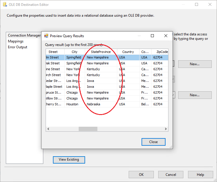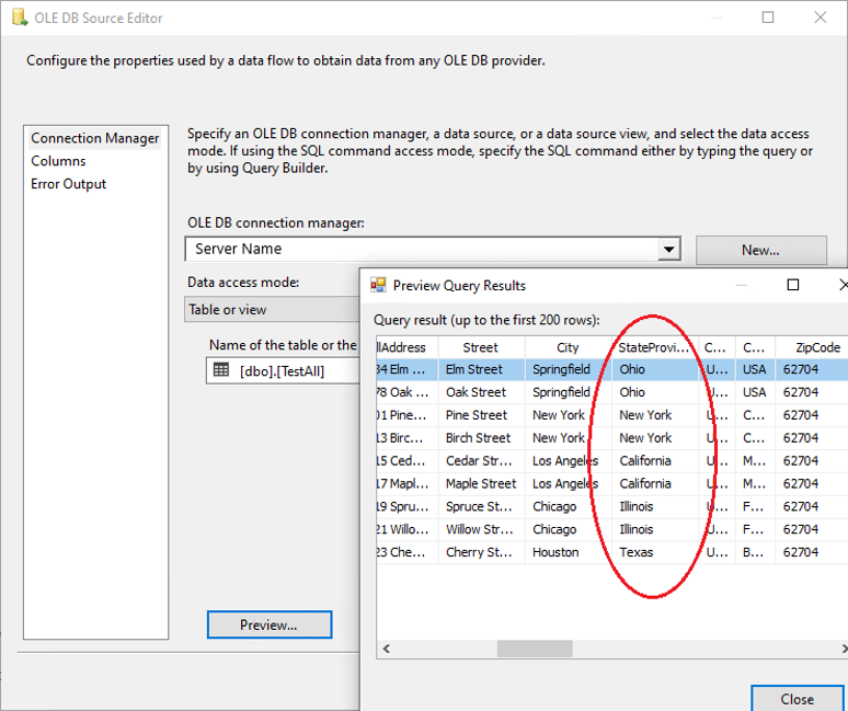 8. Now, all the configurations are complete for the valid values. You can run the package with the State Province Dynamic Data Masking component, and see the results of data masking: