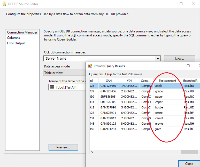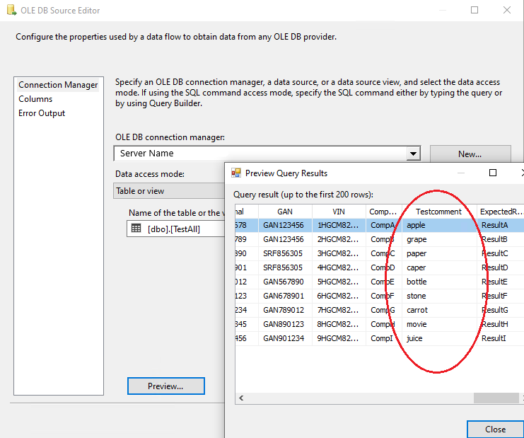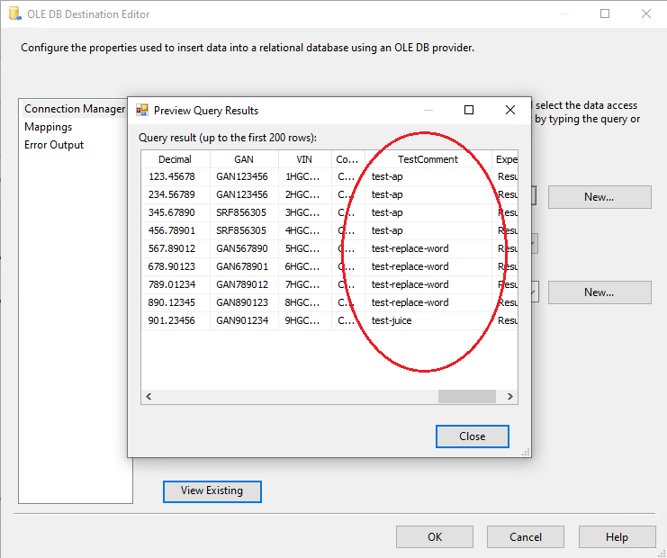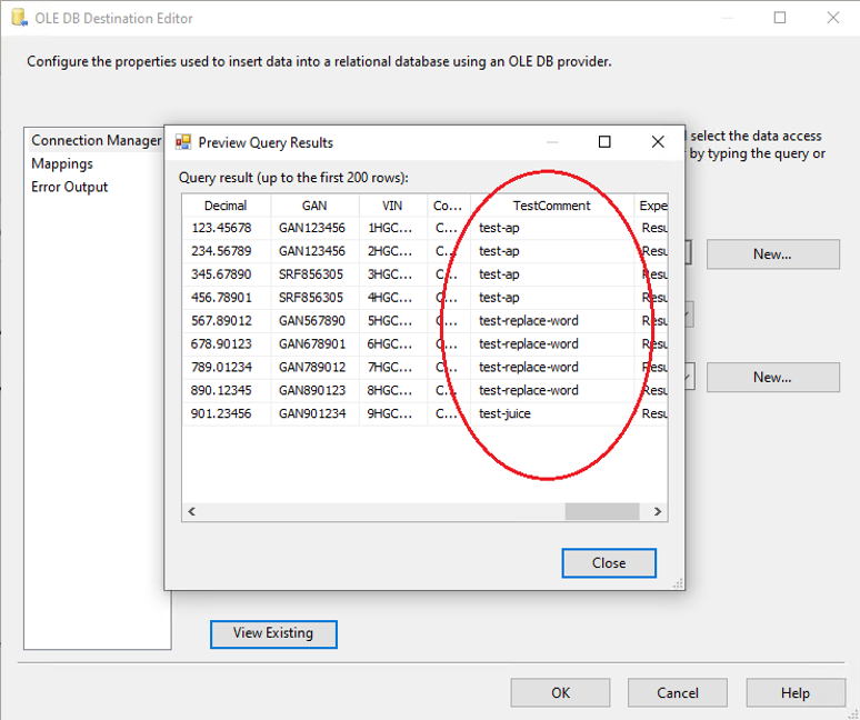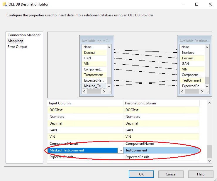 7. Create a connection manager for the destination and configure source component for the destination. In the connection manager, in the tab “Mappings”, specify that you want newly created Field_Masked to be a field replacing the original value. For that, just click on the available input columns, choose the masked value, and map to the “Available Destination Columns”