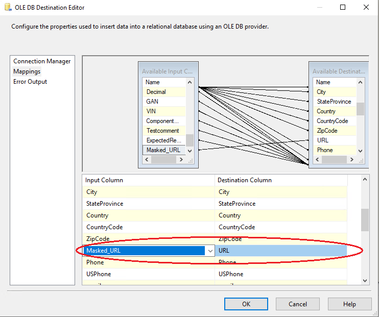 7. Create a connection manager for the destination and configure source component for the destination. In the connection manager, in the tab “Mappings”, specify that you want newly created Field_Masked to be a field replacing the original value. For that, just click on the available input columns, choose the masked value, and map to the “Available Destination Columns”