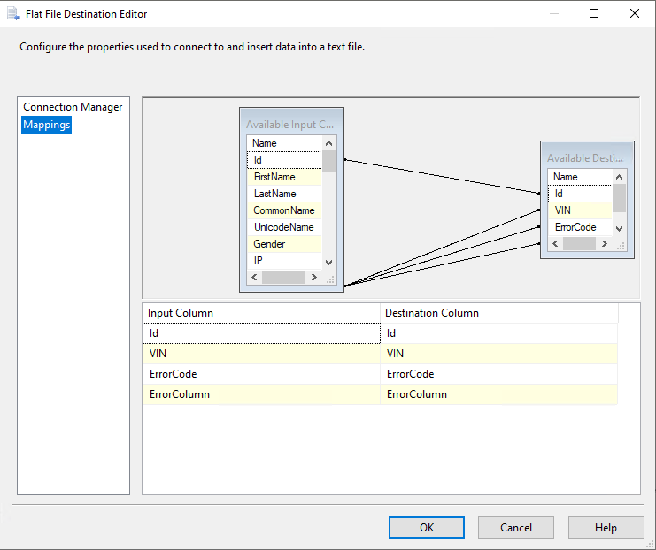 7. Create a connection manager for the destination and configure source component for the destination. In the connection manager, in the tab “Mappings”, specify that you want newly created Field_Masked to be a field replacing the original value. For that, just click on the available input columns, choose the masked value, and map to the “Available Destination Columns”